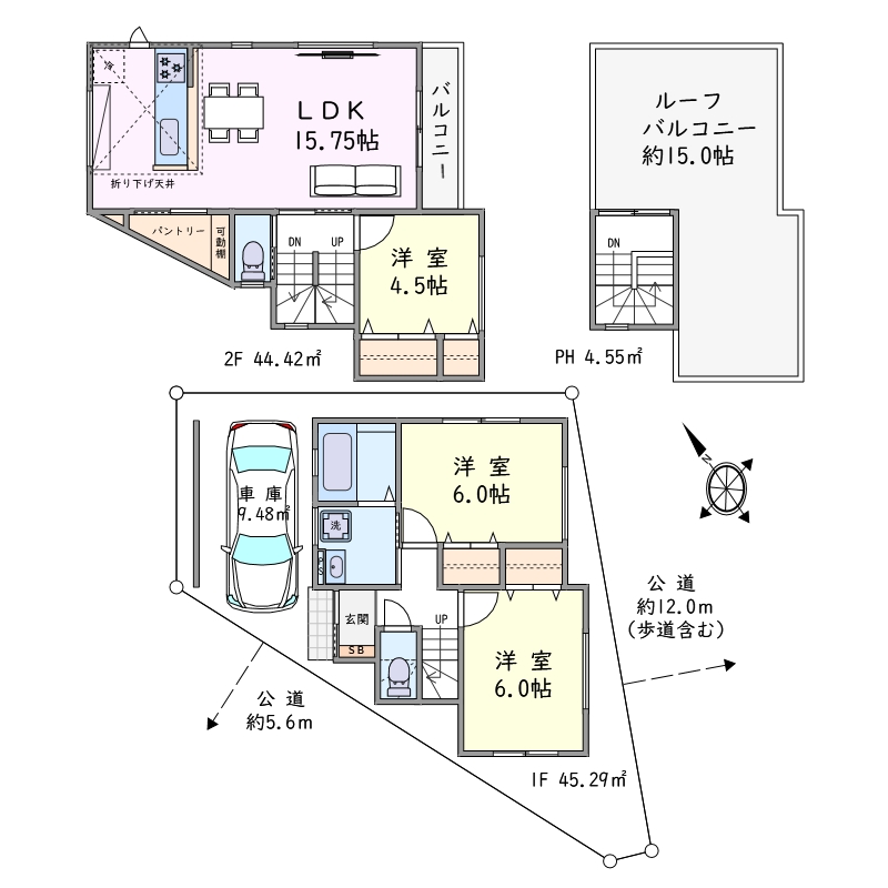 | 前面道路 | 南東側約12.0m公道・西側約5.6m公道 |